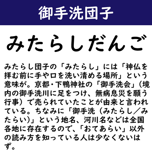 みたらし団子の「みたらし」には「神仏を拝む前に手や口を洗い清める場所」という意味が。京都・下鴨神社の「御手洗会」(境内の御手洗川に足をつけ、無病息災を願う行事)で売られていたことが由来と言われている。ちなみに「御手洗(みたらし/みたらい)」という地名、河川名などは全国各地に存在するので、「おてあらい」以外の読み方を知っている人は少なくないはず。