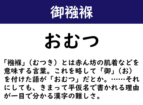 「襁褓」(むつき)とは赤ん坊の肌着などを意味する言葉。これを略して「御」(お)を付けた語が「おむつ」だとか。……それにしても、きまって平仮名で書かれる理由が一目で分かる漢字の難しさ。