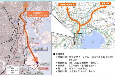 整備区間は東京貨物ターミナル駅〜羽田空港新駅(仮称)間の約5キロ。JR東は、この区間から東京駅を経て、宇都宮・高崎・常磐方面に向かうルートなどを構想。
