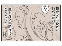 作者は漫画家のぬこー様(@nukosama)さん。「刀のおもちゃ付き節分セット」をスーパーで見つけて、怖い想像をしてしまいます。節分に豆を投げる時代は終わり、子どもが鬼役のお父さんの首を落とす時代になったのかと。