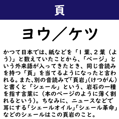 かつて日本では、紙などを「1葉、2葉(よう)」と数えていたことから、「ページ」という外来語が入ってきたとき、同じ音読みを持つ「頁」を当てるようになったと言われる。また、別の音読みで「頁岩」(けつがん)と書くと「シェール」という、岩石の一種を指す言葉に(本のページのように薄く割れるという)。ちなみに、ニュースなどで耳にする「シェールオイル」「シェール革命」などのシェールはこの頁岩のこと。