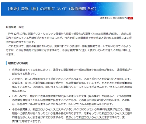 日本感染症学会は、英国で出現した新型コロナウイルスの「変異株」をめぐる報道において、一部報道機関で「変異種」との誤用が見られると指摘。報道機関に向けて正しく表記するよう呼びかけています