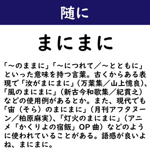 「〜のままに」「〜につれて/〜とともに」といった意味を持つ言葉。古くからある表現で「汝がまにまに」(万葉集/山上憶良)、「風のまにまに」(新古今和歌集/紀貫之)などの使用例があるとか。また、現代でも「宙(そら)のまにまに」(月刊アフタヌーン/柏原麻実)、「灯火のまにまに」(アニメ「かくりよの宿飯」OP曲)などのように使われていることがある。語感が良いよね、まにまに。