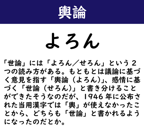 「世論」には「よろん/せろん」という2つの読み方がある。もともとは議論に基づく意見を指す「輿論(よろん)」、感情に基づく「世論(せろん)」と書き分けることができたそうなのだが、1946年に公布された当用漢字では「輿」が使えなかったことから、どちらも「世論」と書かれるようになったのだとか。