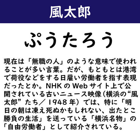 現在は「無職の人」のような意味で使われることが多い言葉。だが、もともとは港湾で荷役などをする日雇い労働者を指す表現だったとか。NHKのWebサイト上で公開されている古いニュース映像(横浜の風太郎”たち/1948年)では、特に「明日の朝は凍え死ぬかもしれない、出たとこ勝負の生活」を送っている「横浜名物」の「自由労働者」として紹介されている。