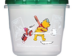 フリーザーバッグ、イージージッパー、スクリューロック、コンテナーに描かれているのは、暖かくなるこれからの季節に向けてさまざまなスポーツを楽しむプーさんたち。中でも注目なのは、「ジップロック イージージッパー M(350円)」「ジップロック スクリューロック 730ml(400円/税別、以下同)」に描かれている野球を楽しむプーさんのアートです。