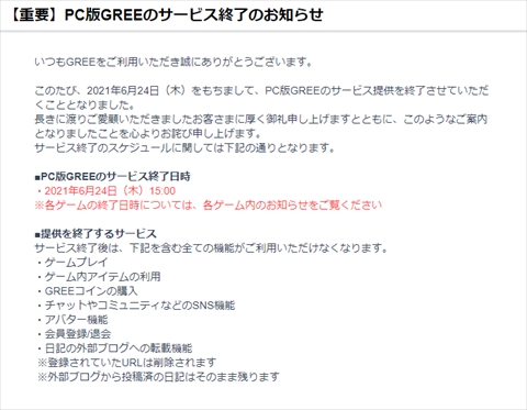GREEはPC版サービスを2021年6月24日15時に終了すると発表しました