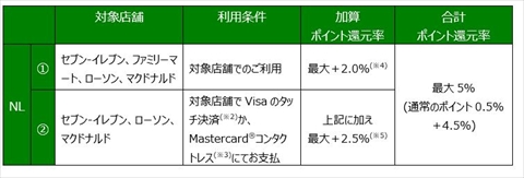 年会費は永年無料。ポイントサービスは通常のポイント還元率0.5%に加え、セブン-イレブンなど対象店舗ではさらにポイントを加算する特典も設けます。