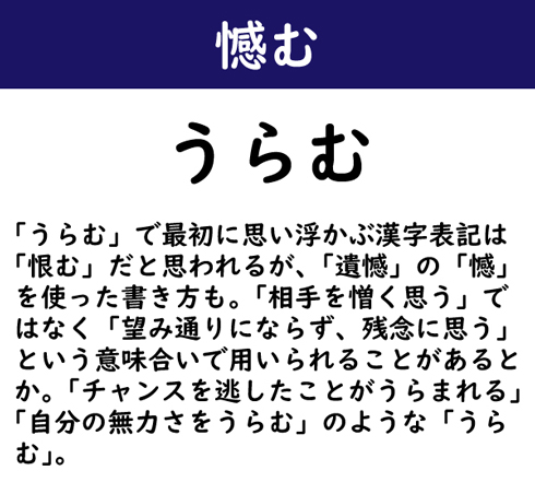 「うらむ」で最初に思い浮かぶ漢字表記は「恨む」だと思われるが、「遺憾」の「憾」を使った書き方も。「相手を憎く思う」ではなく「望み通りにならず、残念に思う」という意味合いで用いられることがあるとか。「チャンスを逃したことがうらまれる」「自分の無力さをうらむ」のような「うらむ」。