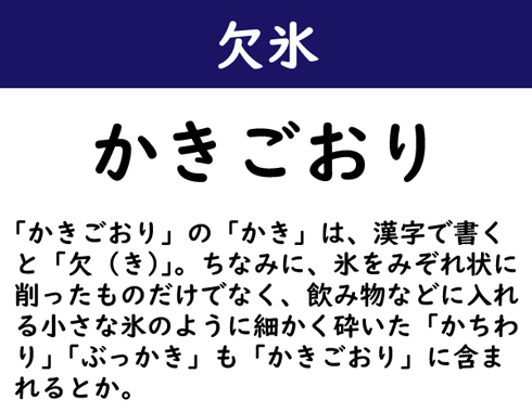 「かきごおり」の「かき」は、漢字で書くと「欠(き)」。ちなみに、氷をみぞれ状に削ったものだけでなく、飲み物などに入れる小さな氷のように細かく砕いた「かちわり」「ぶっかき」も「かきごおり」に含まれるとか。