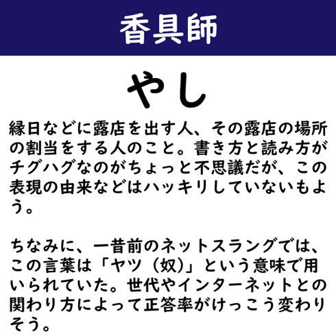 縁日などに露店を出す人、その露店の場所の割当をする人のこと。書き方と読み方がチグハグなのがちょっと不思議だが、この表現の由来などはハッキリしていないもよう。ちなみに、一昔前のネットスラングでは、この言葉は「ヤツ(奴)」という意味で用いられていた。世代やインターネットとの関わり方によって正答率がけっこう変わりそう。