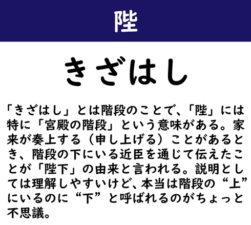 「きざはし」とは階段のことで、「陛」には特に「宮殿の階段」という意味がある。家来が奏上する(申し上げる)ことがあるとき、階段の下にいる近臣を通じて伝えたことが「陛下」の由来と言われる。説明としては理解しやすいけど、本当は階段の“上”にいるのに“下”と呼ばれるのがちょっと不思議。