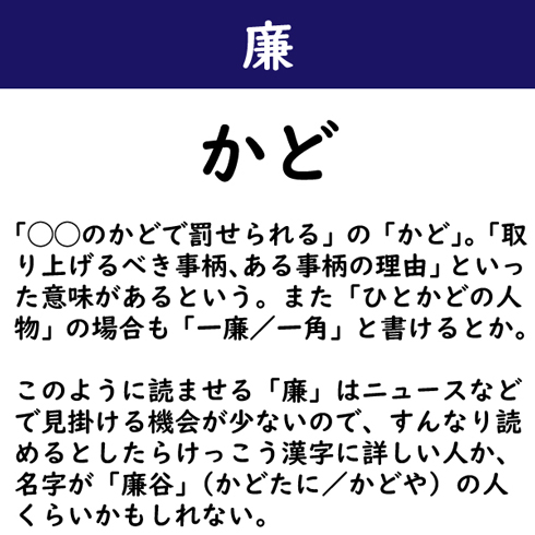 「◯◯のかどで罰せられる」の「かど」。「取り上げるべき事柄、ある事柄の理由」といった意味があるという。また「ひとかどの人物」の場合も「一廉/一角」と書けるとか。このように読ませる「廉」はニュースなどで見掛ける機会が少ないので、すんなり読めるとしたらけっこう漢字に詳しい人か、名字が「廉谷」(かどたに/かどや)の人くらいかもしれない。