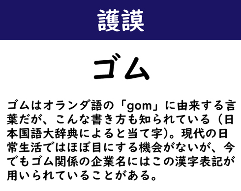 ゴムはオランダ語の「gom」に由来する言葉だが、こんな書き方も知られている(日本国語大辞典によると当て字)。現代の日常生活ではほぼ目にする機会がないが、今でもゴム関係の企業名にはこの漢字表記が用いられていることがある。