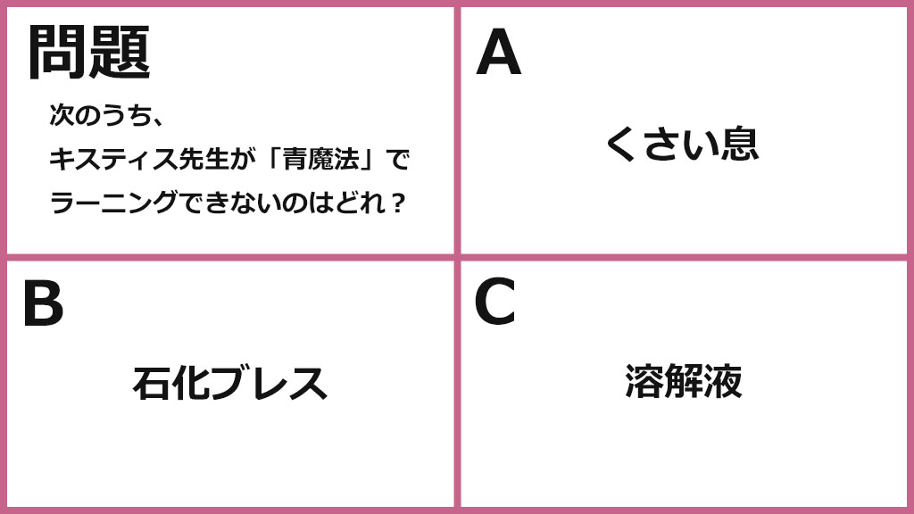 出題は初期メンバーの一人、キスティス先生について。彼女はモンスターの技を覚えて使用する「青魔法」の使い手ですが、次のうちキスティス先生がラーニングできない技は?