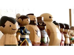 鉄腕アトムやストリートファイター、ベイマックスなど、古今東西の漫画やアニメ・ゲームのキャラクターをデフォルメした木彫り人形が、かわいらしくも勇壮です。整列して一方向を見つめる構図が、最終決戦へ臨むヒーロー軍団のよう。