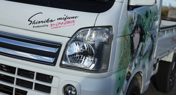 ベースとなっているのはトヨタ・マークII。サイドガラスとリアガラスに今井リサのイラストをラッピングしています。「Roselia」の衣装と同じ、青と緑を混ぜたグラデーションがとても美しい仕上がり。ラッピングは各ウインドウのガラスのみにも関わらず、すさまじい存在感を放っています。