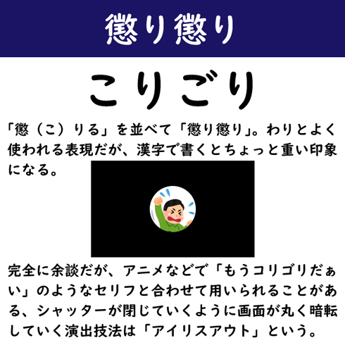 「懲(こ)りる」を2つ並べて「懲り懲り」。わりとよく使われる表現だが、漢字で書くとちょっと重い印象になる。完全に余談だが、アニメなどで「もうコリゴリだよぉ」のようなセリフと合わせて用いられることがある、シャッターが閉じていくように画面が丸く暗転していく演出技法は「アイリスアウト」という。
