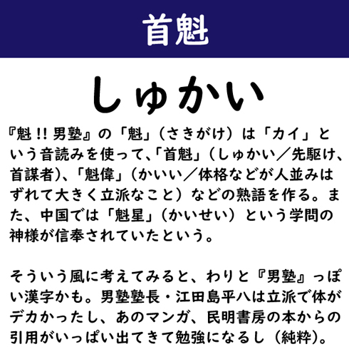 『魁!!男塾』の「魁」(さきがけ)は「カイ」という音読みを使って、「首魁」(しゅかい/先駆け、首謀者)、「魁偉」(かいい/体格などが人並みはずれて大きく立派なこと)などの熟語を作る。また、中国では「魁星」(かいせい)という学問の神様が信奉されていたという。そういう風に考えてみると、わりと『男塾』っぽい漢字かも。男塾塾長・江田島平八は立派で体がデカかったし、あのマンガ、民明書房の本からの引用がいっぱい出てきて勉強になるし(純粋)。