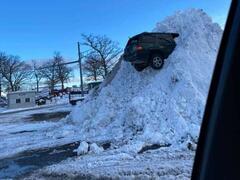 見上げるほどの高さまで積み上がった雪の山に、なぜかクルマが突っ込んでいる姿が目撃され、「何がどうしてこうなったんだ」と話題になっていました。