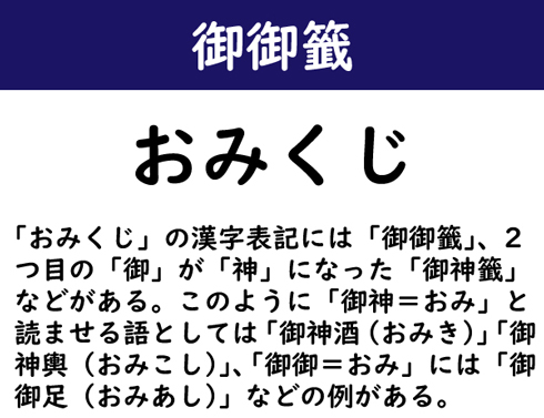 「おみくじ」の漢字表記には「御御籤」、2つ目の「御」が「神」になった「御神籤」などがある。このように「御神=おみ」と読ませる語としては「御神酒(おみき)」「御神輿(おみこし)」、「御御=おみ」には「御御足(おみあし)」などの例がある。
