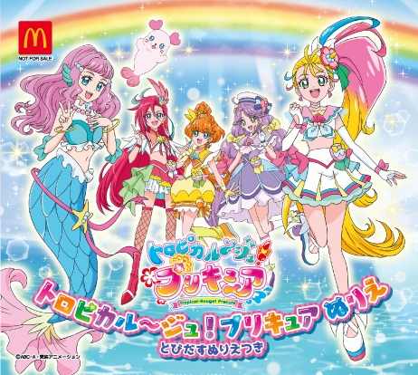 ハッピーセット「トロピカル〜ジュ!プリキュア」はぬりえブックが付属。マクドナルドのメニューを持ったキャラのオリジナルぬりえや、ぬりえ読み込むとキャラが飛び出すアプリ「でるとる」に対応したものもあります。