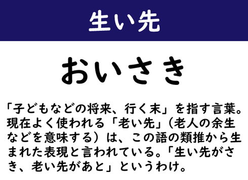 「子どもなどの将来、行く末」を指す言葉。現在よく使われる「老い先」(老人の余生などを意味する)は、この語の類推から生まれた表現と言われている。つまり、生い先がさき、老い先があとというワケ。ちなみに、「生=お」と読ませる他の表現としては「生い立ち」「生い茂る」などがある。