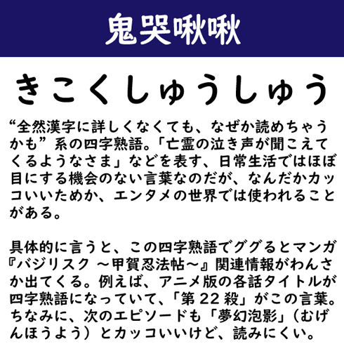 “全然漢字に詳しくなくても、なぜか読めちゃうかも”系の四字熟語。「亡霊の泣き声が聞こえてくるようなさま」などを表す、日常生活ではほぼ目にする機会のない言葉なのだが、なんだかカッコいいためか、エンタメの世界では使われることがある。具体的に言うと、この四字熟語でググるとマンガ『バジリスク 〜甲賀忍法帖〜』関連情報がわんさか出てくる。例えば、アニメ版の各話タイトルが四字熟語になっていて、「第22殺」がこの言葉。ちなみに、次のエピソードも「夢幻泡影」(むげんほうよう)とカッコいいけど、読みにくい。
