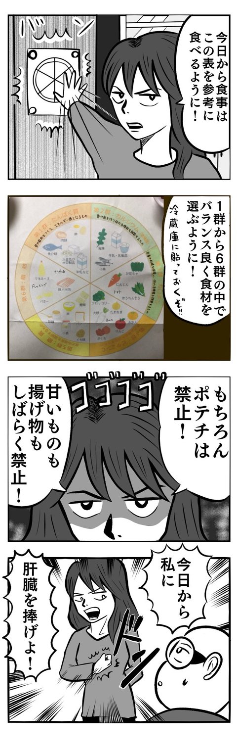 そんな病気と診断された「すな(@sunamangakaku)」さんは、妻に支えられながらの節制生活を漫画に描いています。脂肪肝を甘く見てはいけないッ!