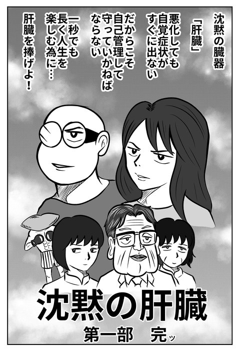肝臓は悪化しても自覚症状が出ない“沈黙の臓器”。一秒でも長く人生を楽しむためにも、自己管理して守っていかねばならないと、パロディ盛り盛りのカオスな最終ページにて結んでいます。