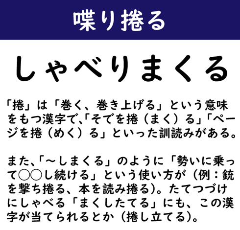 「捲」は「巻く、巻き上げる」という意味をもつ漢字で、「そでを捲(まく)る」「ページを捲(めく)る」といった訓読みがある。また、「〜しまくる」のように「勢いに乗って◯◯し続ける」という使い方が(例:銃を撃ち捲る、本を読み捲る)。たてつづけにしゃべる「まくしたてる」にも、この漢字が当てられるとか(捲し立てる)。