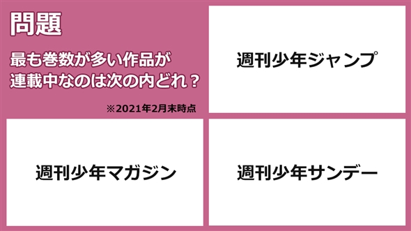 問題:最も巻数が多い作品が連載中なのは次の内どれ?(※2021年2月末時点で)