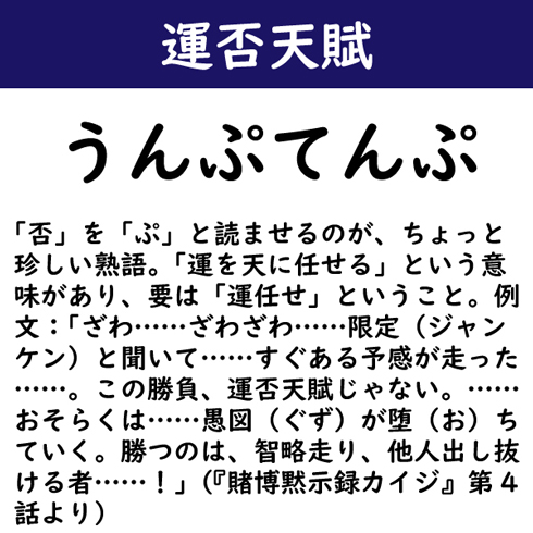 「否」を「ぷ」と読ませるのが、ちょっと珍しい熟語。「運を天に任せる」という意味があり、要は「運任せ」ということ。例文:「ざわ……ざわざわ……限定(ジャンケン)と聞いて……すぐある予感が走った……。この勝負、運否天賦じゃない。……おそらくは……愚図(ぐず)が堕(お)ちていく。勝つのは、智略走り、他人出し抜ける者……!」(『賭博黙示録カイジ』第4話より)