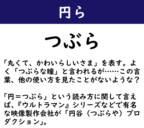 「丸くて、かわいらしいさま」を表す。よく「つぶらな瞳」と言われるが……この言葉、他の使い方を見たことがないような? 「円=つぶら」という読み方に関して言えば、『ウルトラマン』シリーズなどで有名な映像製作会社が「円谷(つぶらや)プロダクション」。