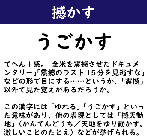 てへん+感。「全米を震撼させたドキュメンタリー」「震撼のラスト15分を見逃すな」などの形で目にする……というか、「震撼」以外で見た覚えがあるだろうか。この漢字には「ゆれる」「うごかす」といった意味があり、他の表現としては「撼天動地」(かんてんどうち/天地をゆり動かす。激しいことのたとえ)などが挙げられる。
