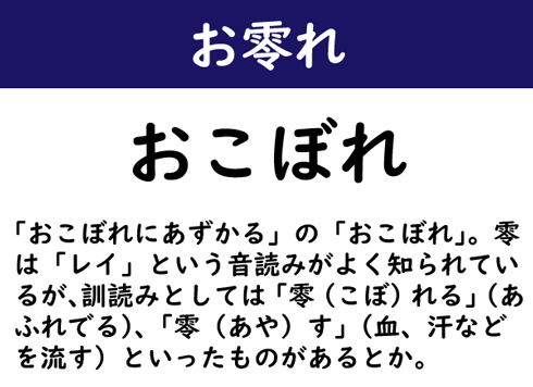 「おこぼれにあずかる」の「おこぼれ」。零は「レイ」という音読みがよく知られているが、訓読みとしては「零(こぼ)れる」(あふれでる)、「零(あや)す」(血、汗などを流す)といったものがあるとか。