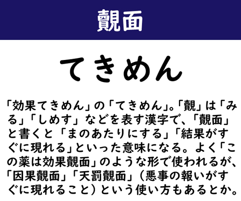 「効果てきめん」の「てきめん」。「覿」は「みる」「しめす」などを表す漢字で、「覿面」と書くと「まのあたりにする」「結果がすぐに現れる」といった意味になる。よく「この薬は効果覿面」のような形で使われるが、「因果覿面」「天罰覿面」(悪事の報いがすぐに現れること)という使い方もあるとか。