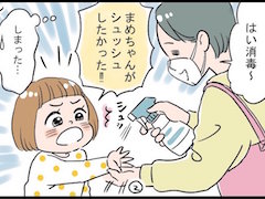 やっとのことでその場から離れ、店内に入るために手指を消毒する2人。しかし、なんでもやってみたい盛りのまめこちゃんは「まめちゃんがシュッシュしたかった!」とお怒りです。