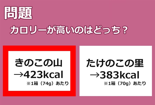 きのこの山は1箱あたり423kcalなのに対して、たけのこの里は1箱あたり383kcal。チョコにコーティングされている表面積が広い分たけのこの里の方が高カロリーかとおもいきや、大きめなチョコの塊を有するきのこの山の方がわずかに高カロリーという結果になりました。