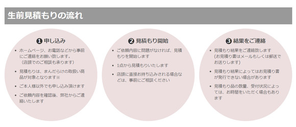 生前見積は名前の通り、コレクションの行く末を考えているコレクター向けのサービス。漫画やアニメ関連のグッズ、玩具や鉄道模型など、まんだらけが取り扱っているアイテムを対象に、1度につき100点まで無料で査定してもらえます。コレクター本人でなくとも申し込むことができ、査定したからといって必ず売却しなければならないわけではありません。