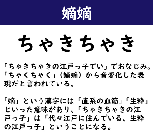 「ちゃきちゃきの江戸っ子でい」でおなじみ。「ちゃくちゃく」(嫡嫡)から音変化した表現ではないか、と言われている。「嫡」には「直系の血筋」「生粋」といった意味があり、「ちゃきちゃきの江戸っ子」は「代々江戸に住んでいる、生粋の江戸っ子」ということになる。