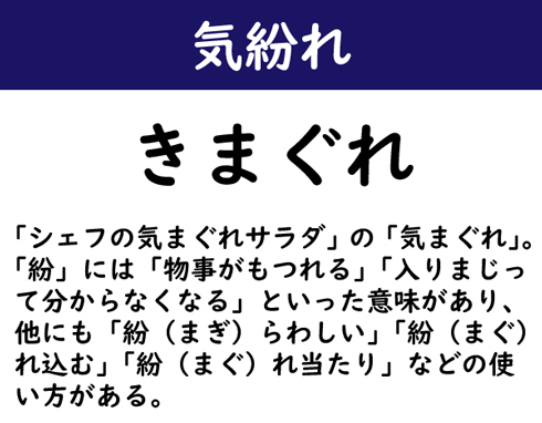 「シェフの気まぐれサラダ」の「気まぐれ」。「紛」には「物事がもつれる」「入りまじって分からなくなる」といった意味があり、他にも「紛(まぎ)らわしい」「紛(まぐ)れ込む」「紛(まぐ)れ当たり」などの使い方がある。