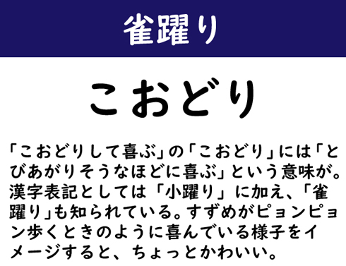 「こおどりして喜ぶ」の「こおどり」には「とびあがりそうなほどに喜ぶ」という意味が。漢字表記としては「小躍り」に加え、「雀躍り」も知られている。すずめがピョンピョン歩くときのように喜んでいる様子をイメージすると、ちょっとかわいい。