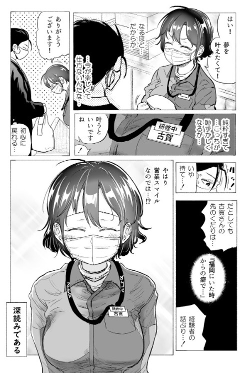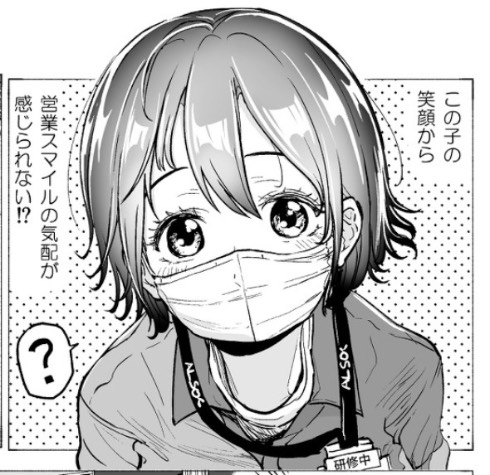 めちゃくちゃピュアな古賀さんですが、話を聞くと、どうやらコンビニでの仕事は経験がある様子。となるとやっぱりこれは「めちゃくちゃうまい営業スマイル」なのか!? マスクごしでも伝わってくる古賀さんのスマイルに混乱する鈴木。「いつかその営業スマイルの牙城……崩してみせる!」と、肉まんをほおばりながら決意します。いや、だからそれは営業じゃないって! 気付け!