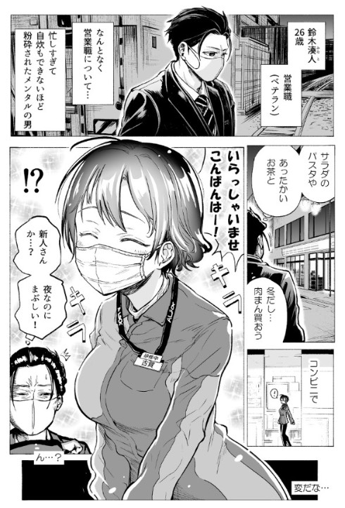 主人公、鈴木は26歳の営業マン。自炊が不可能なほどの激務でズタボロになり、夕食はほとんど近所のコンビニで賄う生活です。そこに現れたのが、新人アルバイトの古賀さん。夜中なのに眩しいほどの笑顔。善意100%だ……。