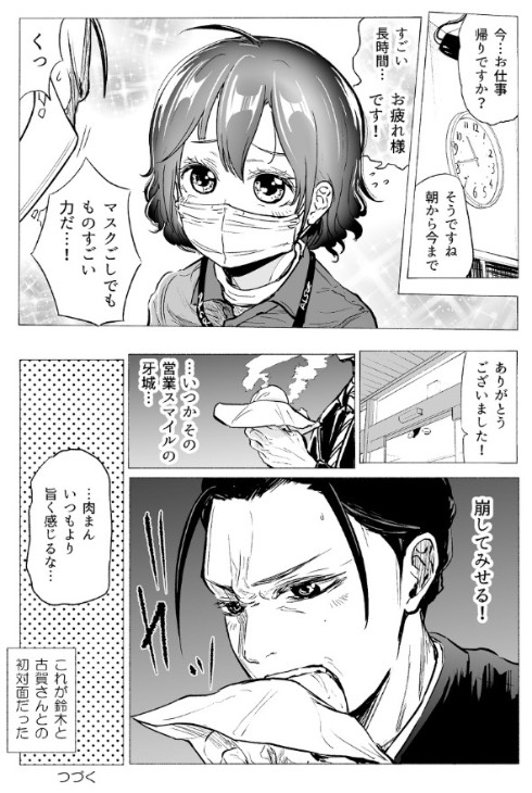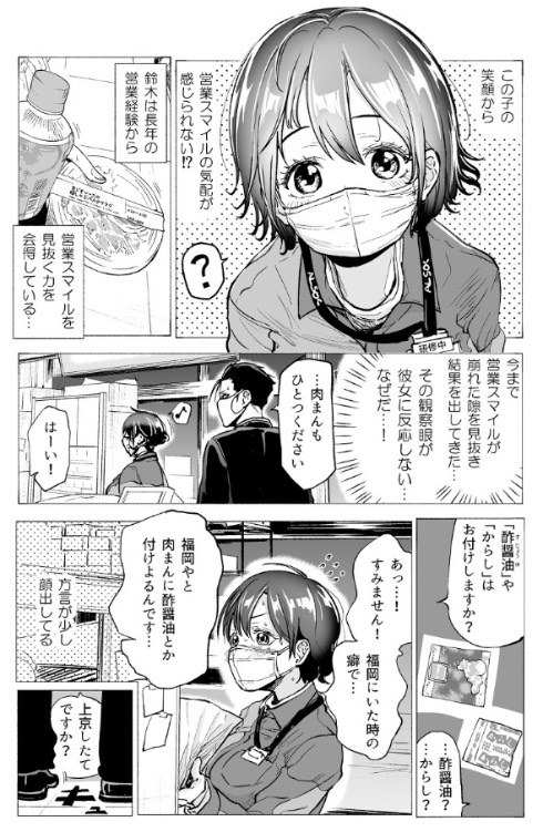 ハードな営業職によってメンタルが擦り切れきった鈴木の特技は、他人の営業スマイルを見抜くこと。しかし古賀さんのスマイルからは営業の匂いゼロ。深夜のコンビニ店員らしからぬ愛想の良さに鈴木は戸惑います。あと肉まんに酢醤油、うまそうだな。