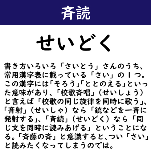 書き方いろいろ「さいとう」さんのうち、常用漢字表に載っている「さい」の1つ。この漢字には「そろう」「ととのえる」といった意味があり、「校歌斉唱」(せいしょう)と言えば「校歌の同じ旋律を同時に歌う」、「斉射」(せいしゃ)なら「銃などを一斉に発射する」、「斉読」(せいどく)なら「同じ文を同時に読みあげる」ということになる。「斉藤の斉」と意識すると、つい「さい」と読みたくなってしまうのでは。