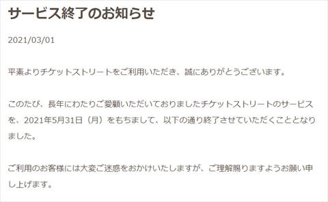 チケット売買仲介サイトの「チケットストリート」が、5月31日をもってサービスを終了すると発表しました。