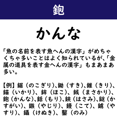 「魚の名前を表す魚へんの漢字」がめちゃくちゃ多いことはよく知られているが、「金属の道具を表す金へんの漢字」もまあまあ多い。【例】鋸(のこぎり)、鋤(すき)、錐(きり)、錨(いかり)、鉾(ほこ)、鉞(まさかり)、鉋(かんな)、銛(もり)、鋏(はさみ)、鎹(かすがい)、鏃(やじり)、鏝(こて)、鑢(やすり)、鑷(けぬき)、鑿(のみ)