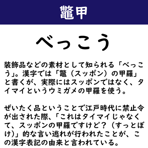 装飾品などの素材として知られる「べっこう」。漢字では「鼈(スッポン)の甲羅」と書くが、実際にはスッポンではなく、タイマイというウミガメの甲羅を使う。ぜいたく品ということで江戸時代に禁止令が出された際、「これはタイマイじゃなくて、スッポンの甲羅ですけど?(すっとぼけ)」的な言い逃れが行われたことが、この漢字表記の由来と言われている。